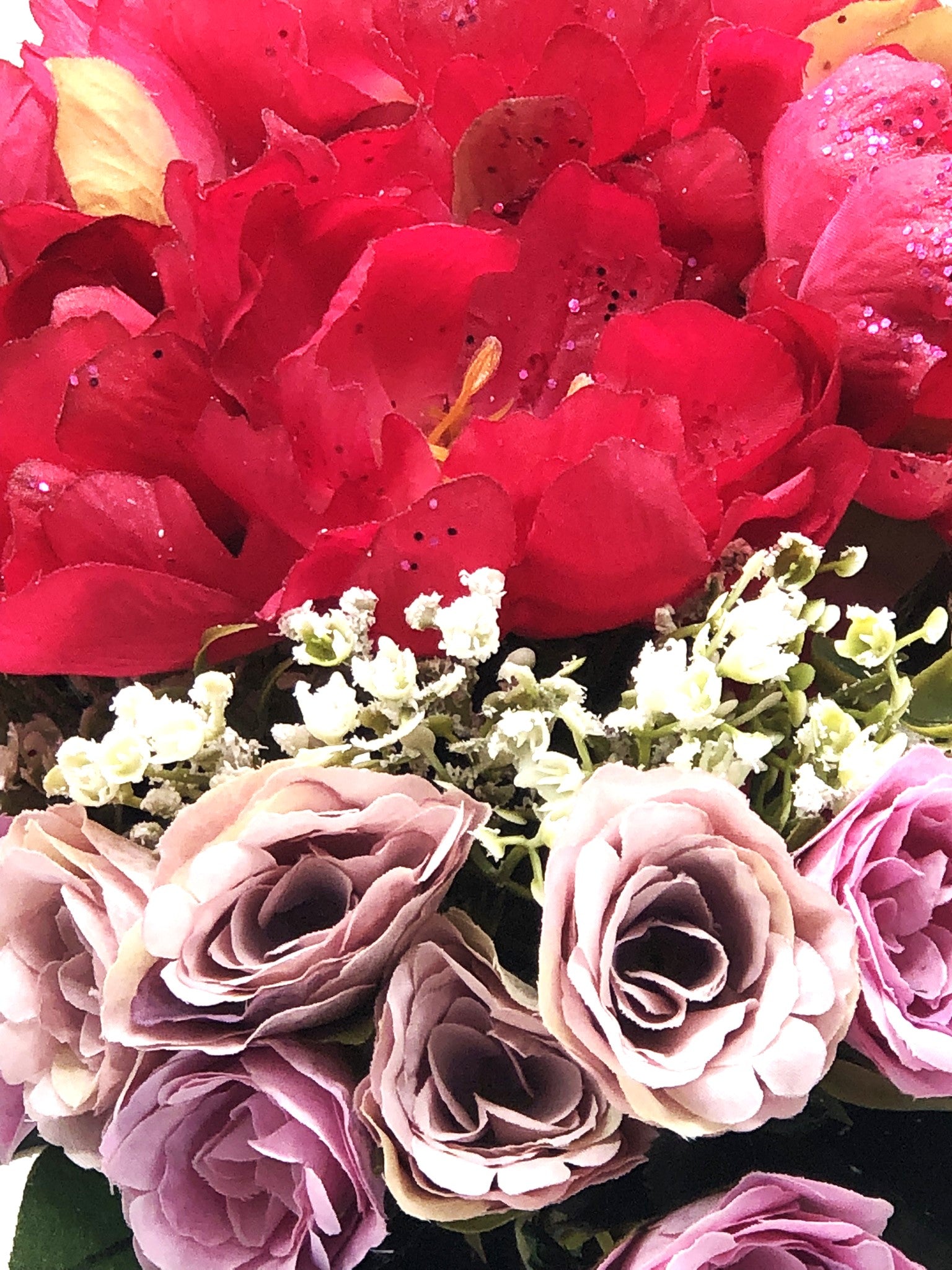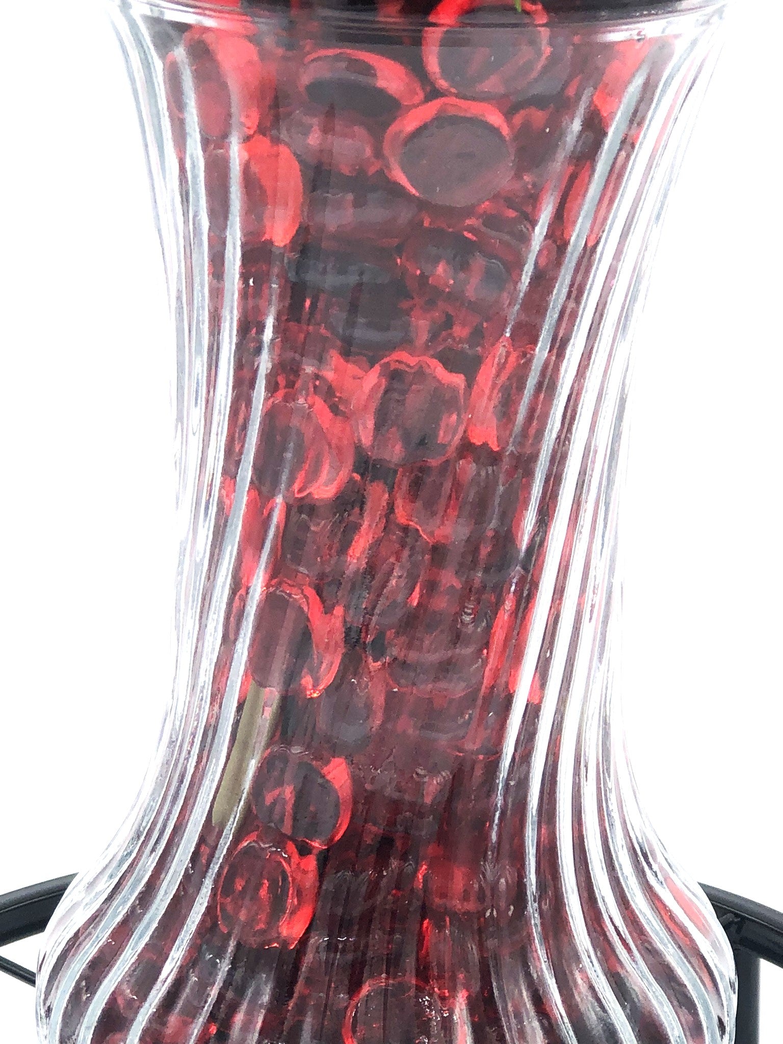 Red/Purple Passion Silk Floral Arrangement with baby's breath in glass-swirl vase filled with red translucent gems.